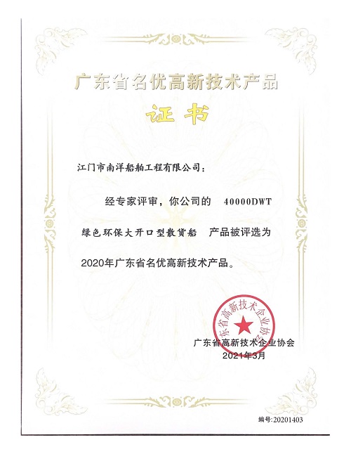 2021年3月 JNS 40000DWT綠色環(huán)保大開口型散貨船被認定為2020年高新技術產品。