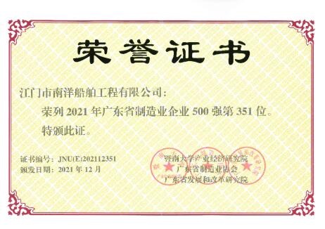 2021年5月25日 JNS第80艘小靈便型散貨船JNS179船順利交付。 ![]() 2021年12月 榮獲“廣東省制造業(yè)企業(yè)500強” 。