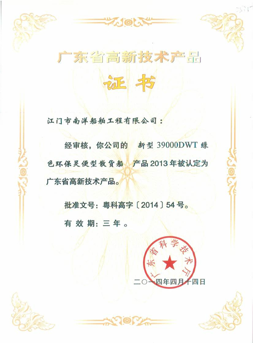 資質(zhì)榮譽(yù)您當(dāng)前位置: 首頁 > 關(guān)于JNS > 資質(zhì)榮譽(yù) > 《39000DWT綠色環(huán)保靈便型散貨船》 被認(rèn)定為廣東省高新技術(shù)產(chǎn)品
