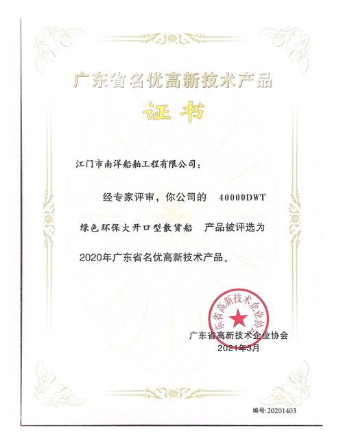 資質榮譽您當前位置: 首頁 > 關于JNS > 資質榮譽 > 《40000DWT綠色環(huán)保大開口型散貨船》 被認定為廣東省名優(yōu)高新技術產(chǎn)品