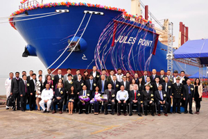 當(dāng)日,該船的命名及交付儀式在我司二號(hào)碼頭隆重舉行。儀式上,公司副總經(jīng)理安波先生和太平洋航運(yùn)(香港)有限公司船隊(duì)總監(jiān)Jay K.Pillai 船長先后致辭表示了祝賀,并對(duì)合作各方均表達(dá)了誠摯的感謝。教母Beena Pillai女士為該船進(jìn)行了正式命名。