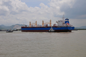 2014年8月18日正午,公司一號碼頭上,樂曲聲在碼頭四周飄揚(yáng),一點(diǎn)整,伴隨著一聲長長的鳴笛,鞭炮聲四起,JNS135船在現(xiàn)場工作人員的注視下起錨離港,正式開始自己的海上生涯。