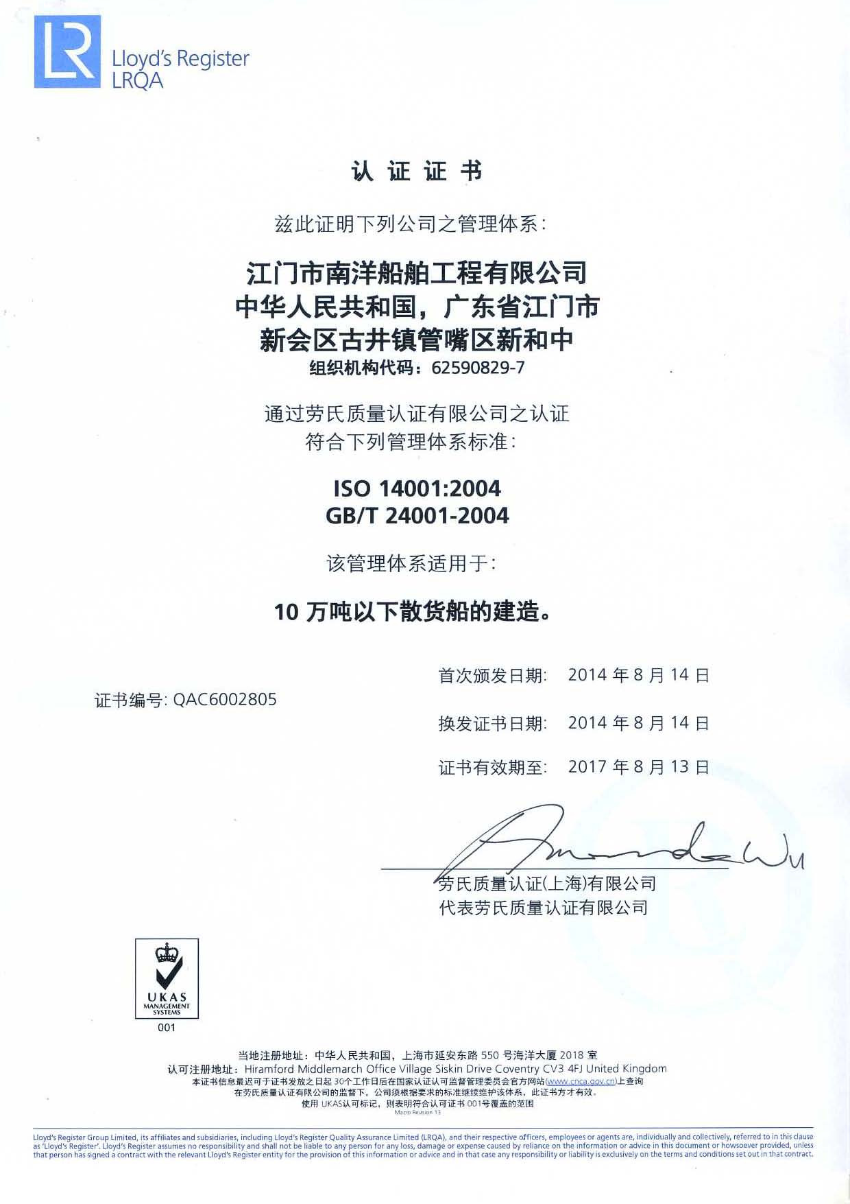 2014年8月14日,我司順利通過了ISO14001:2004環(huán)境管理體系認(rèn)證。