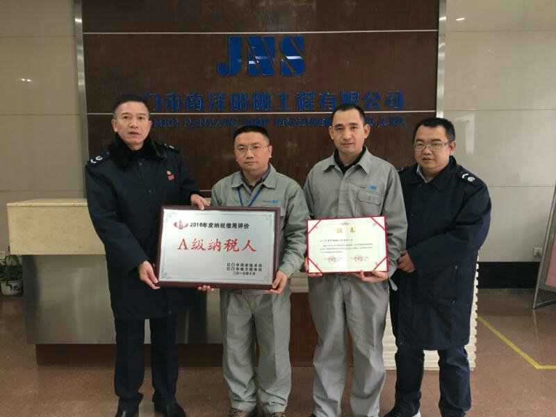 在江門市國(guó)家稅務(wù)局、江門市地方稅務(wù)局2016年納稅信用等級(jí)評(píng)定中,我司被評(píng)定為“A級(jí)納稅人”。2018年1月9日下午,新會(huì)區(qū)地方稅務(wù)局三江分局趙振業(yè)局長(zhǎng)作為頒獎(jiǎng)代表到我司現(xiàn)場(chǎng)頒發(fā)牌匾和證書,財(cái)務(wù)總監(jiān)朱總代表公司領(lǐng)取了獎(jiǎng)牌和證書。