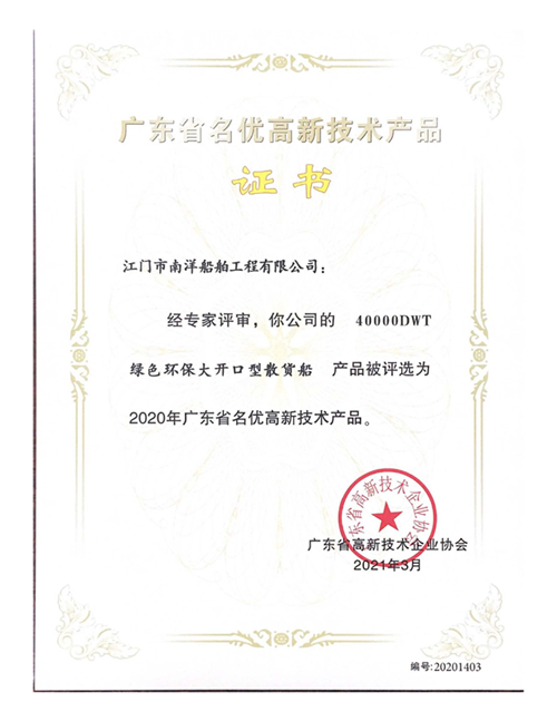 近日,廣東省高新技術企業(yè)協(xié)會發(fā)文《關于公布2020年廣東省名優(yōu)高新技術產品名單的通知》(粵高企協(xié)[2021]3號),我司“40000DWT綠色環(huán)保大開口型散貨船”被認定為廣東省名優(yōu)高新技術產品。